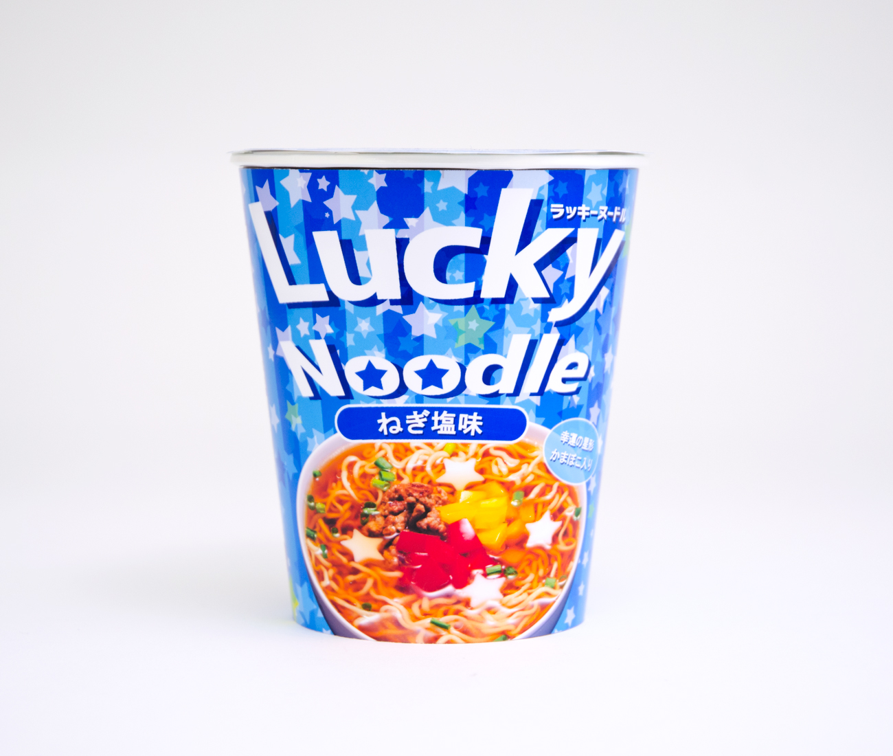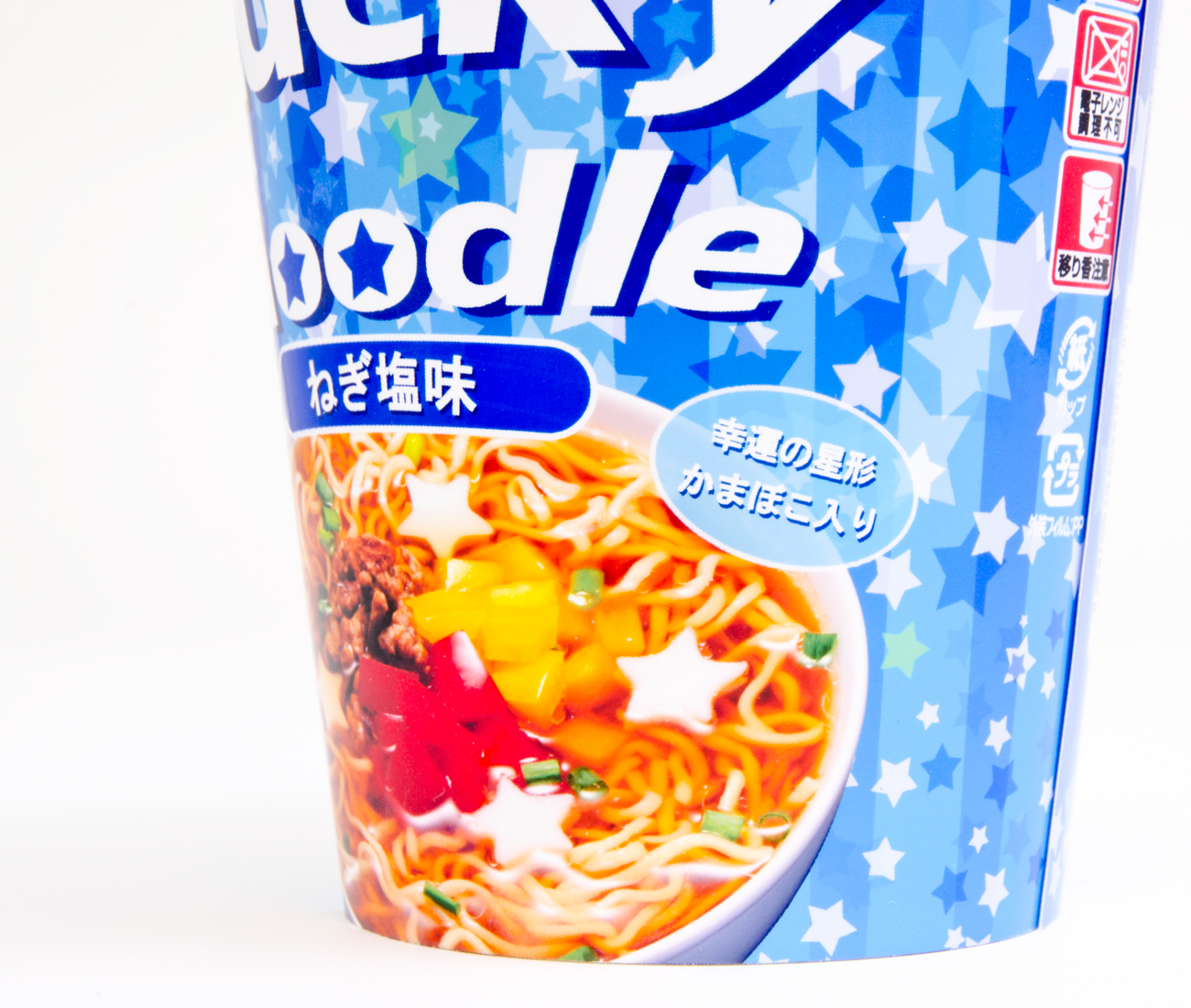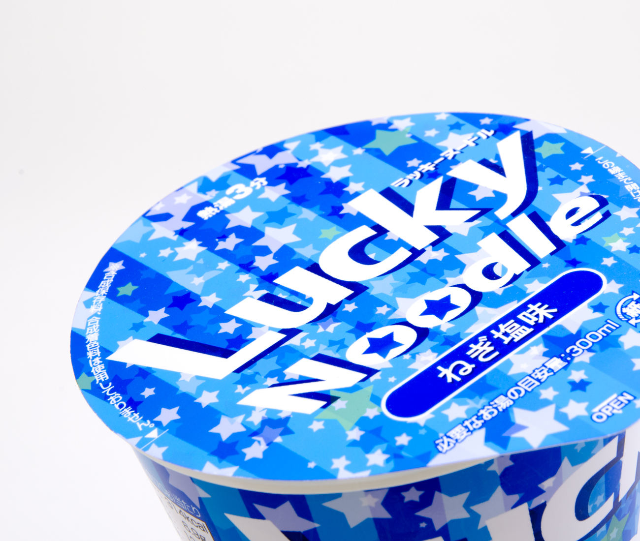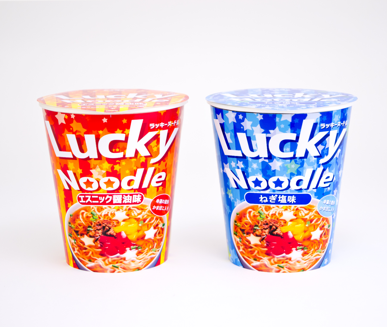 若者をターゲットにしたカップラーメンのパッケージデザインをしました。降り注ぐ幸運をコンセプトに、星を使いはじけるようなイメージで制作をしました。