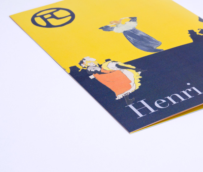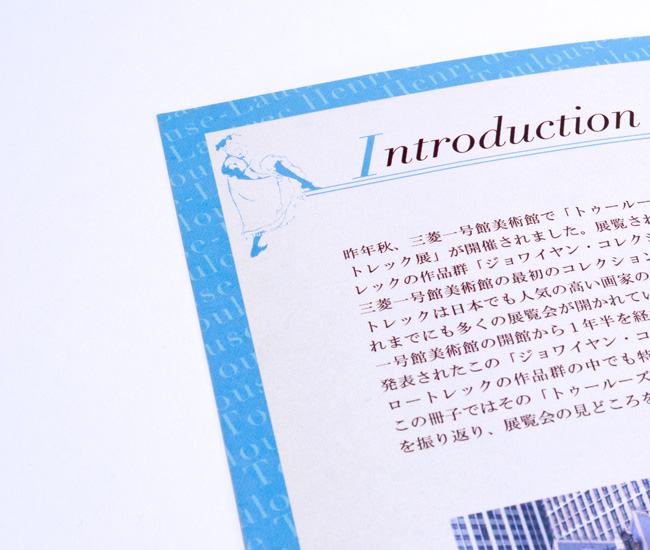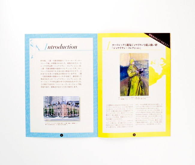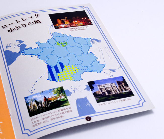 ロートレックを知らない若者にも手に取ってもらえるような冊子を目指して制作しました。所々に彼の作品を入れて楽しい雰囲気になるようにしました。